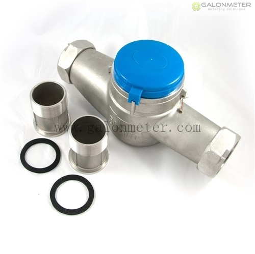 GALONMETER GL-MJ-SS 15-50 is IMPELLER (turbine) water meter with magnetic transmission, dry type register has the sizes from Dn15 to Dn50 designed and manufacture by GALONMETER. Water meters intended for the metering of cold potable water and hot water. -